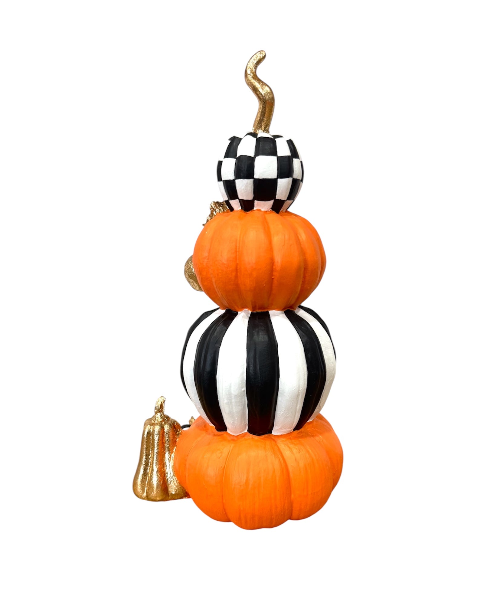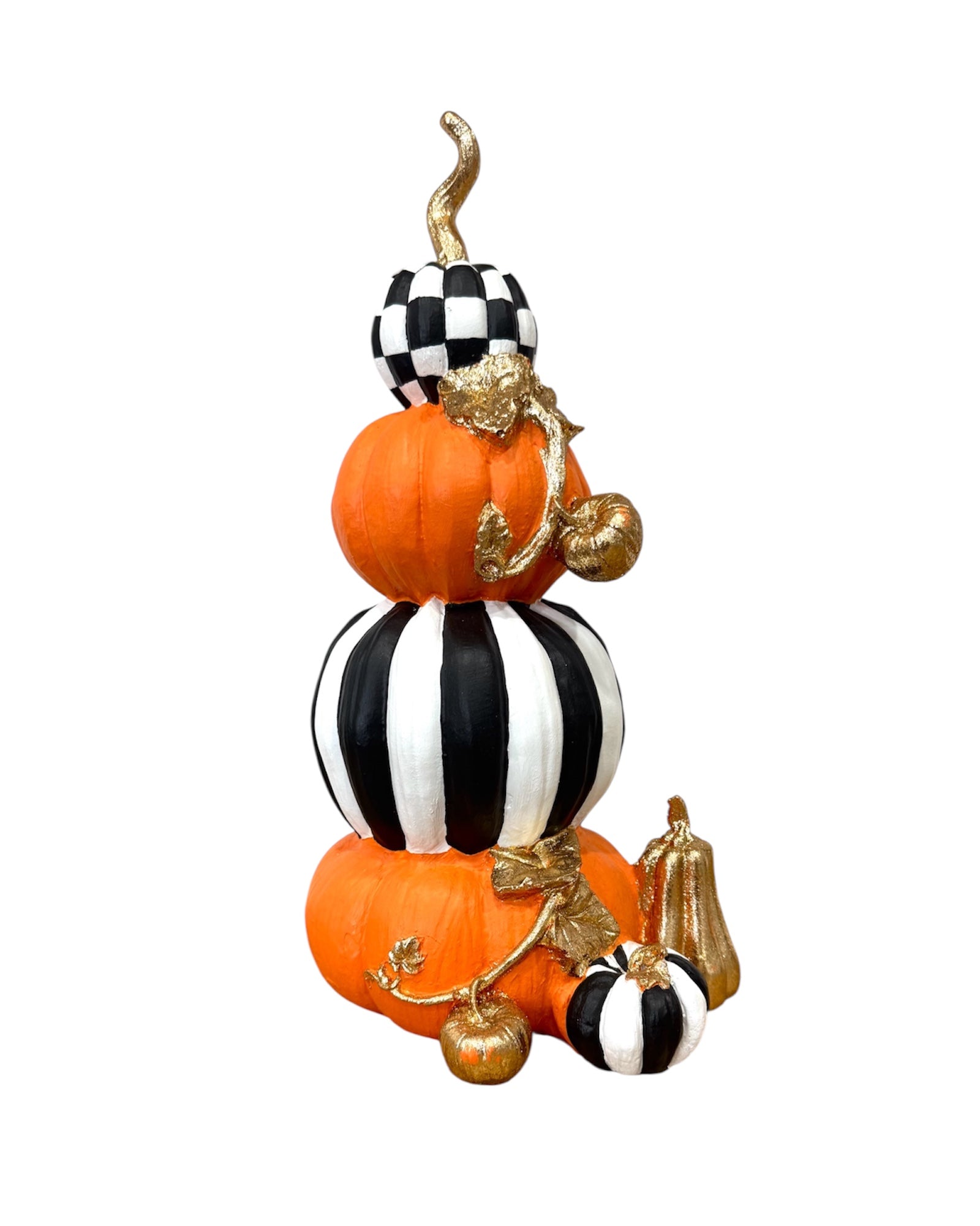 Cadılar Bayramı ve sonbahar dekorasyonunuza sanat dolu ve etkileyici bir hava katacak, el yapımı ve el boyaması polyester bir sanat eseri! Bu zarif heykel, klasik turuncu rengin yanı sıra siyah-beyaz çizgili ve dama desenli kabakların sanatsal bir şekilde üst üste dizilmesiyle oluşturulmuştur.
