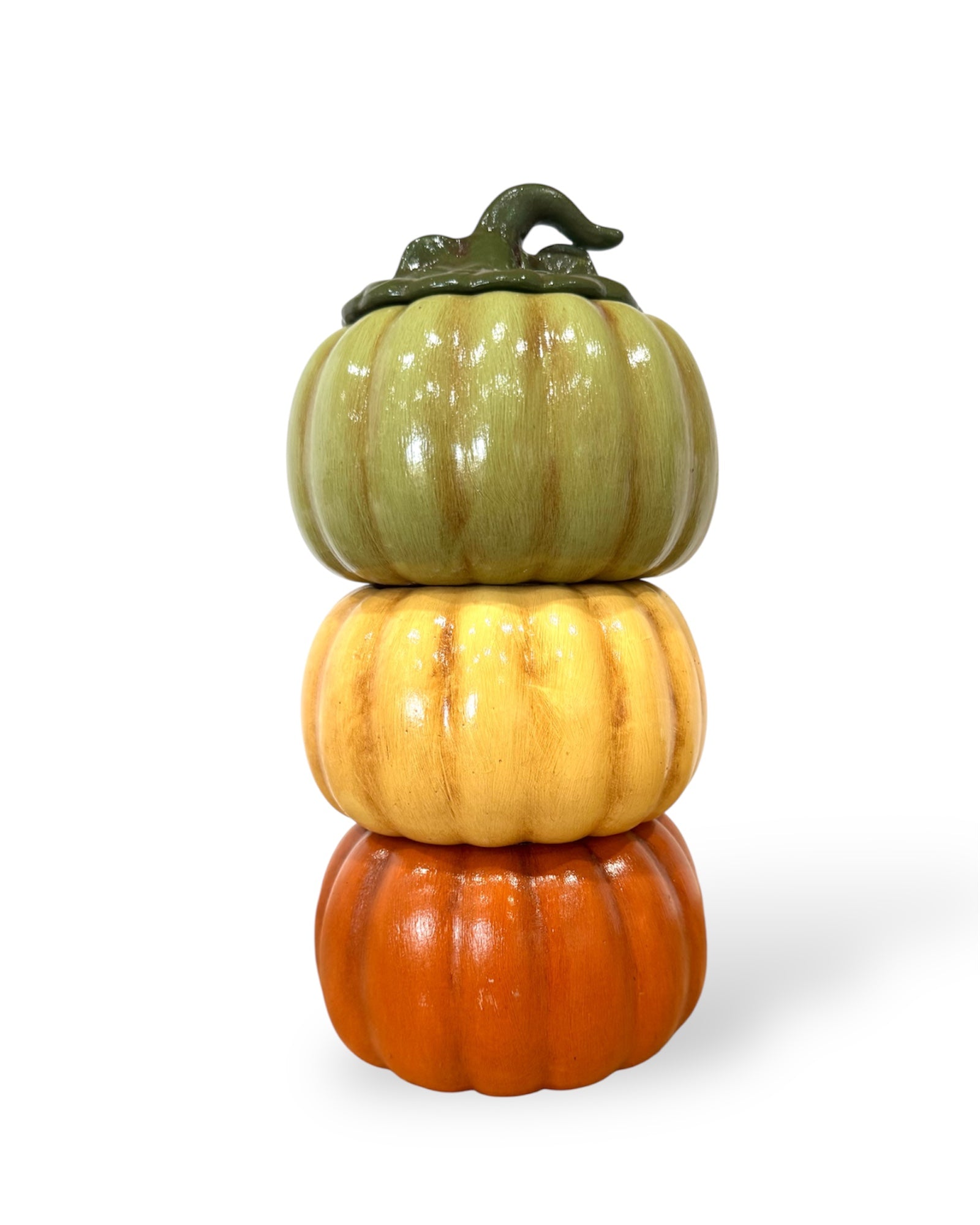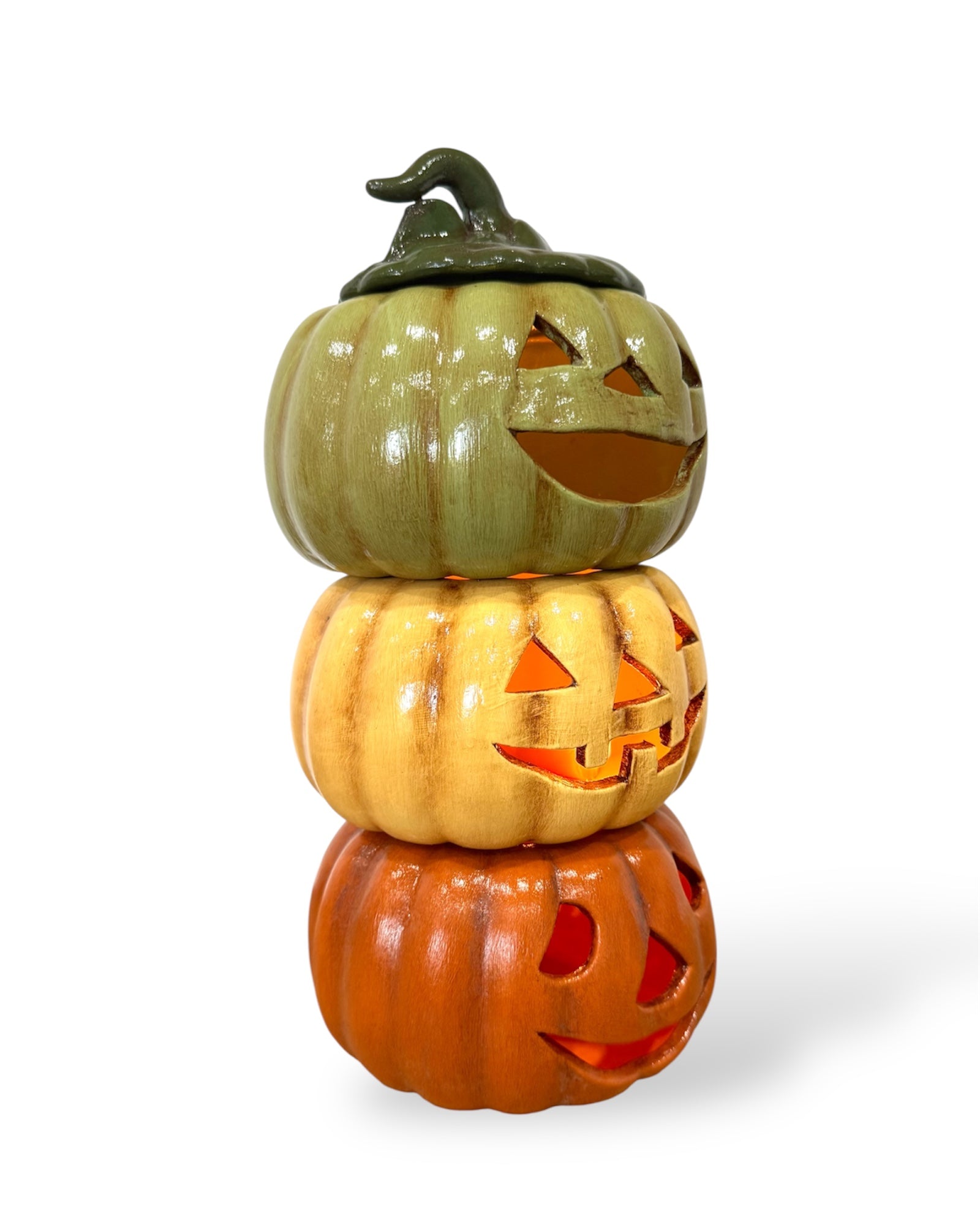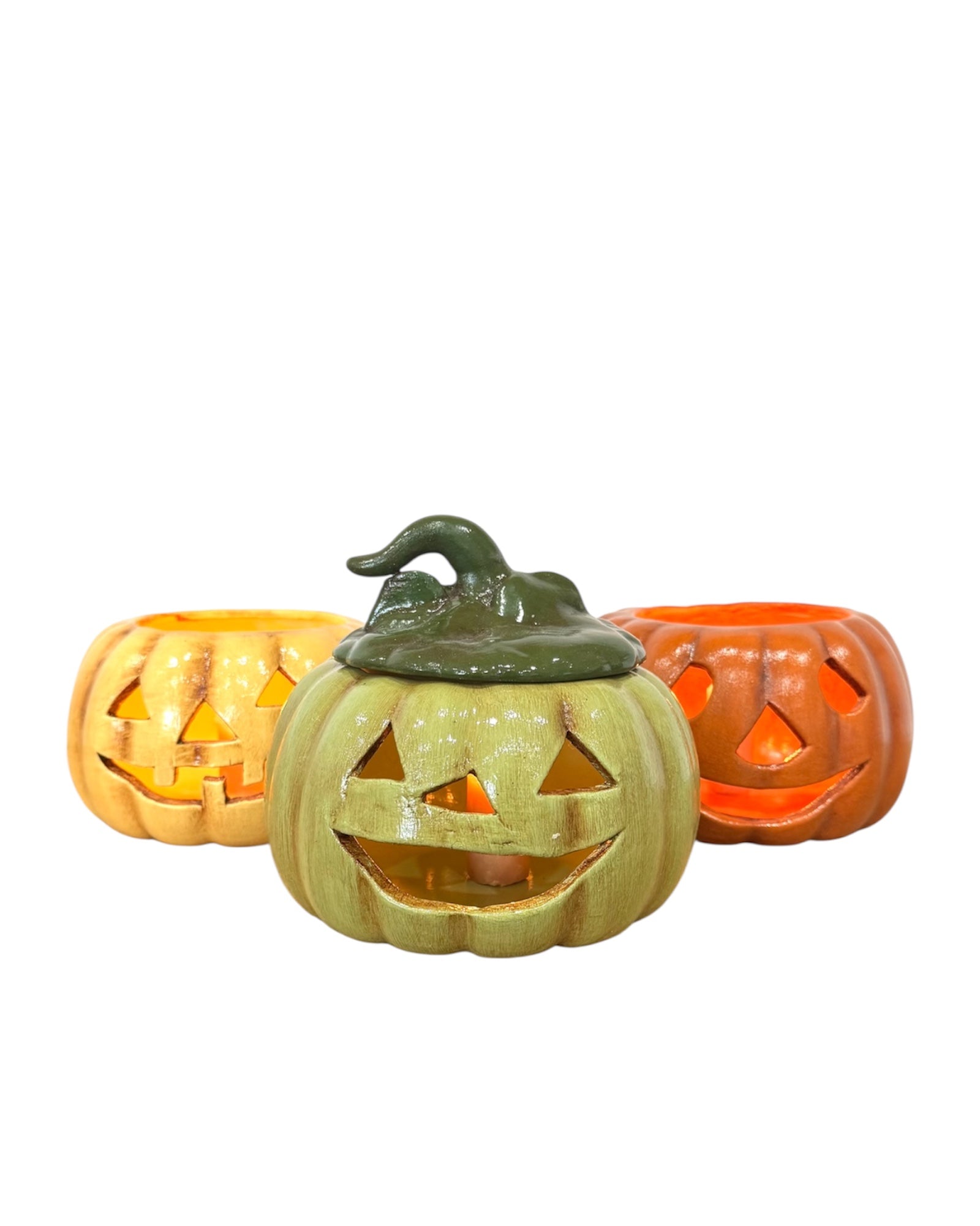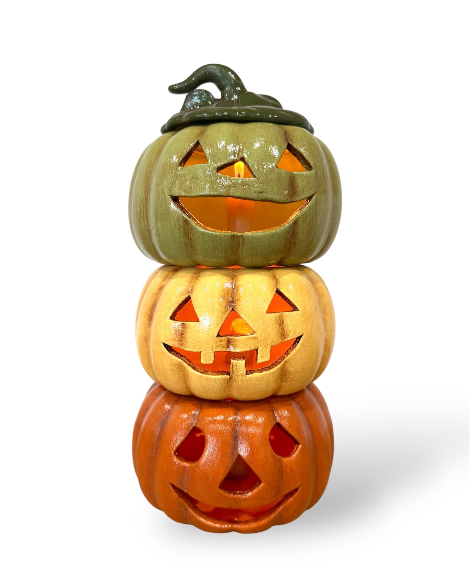 Evinize sonbahar ve cadılar bayramı ruhunu getirecek, el yapımı seramikten üretilmiş bu benzersiz mumluk, dekorasyonunuza sıcak ve neşeli bir dokunuş katıyor. Üst üste duran üç sevimli balkabağı, her biri farklı renk tonlarında (yeşil, sarı ve turuncu), içlerindeki mumun (tealight) ışığıyla parıldayarak etkileyici bir atmosfer yaratır.
